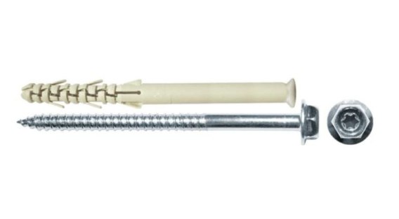 Dybel ramowy , koszulka nylonowa z długą strefą rozporową , wkręt z łbem sześciokątnym z zespoloną podkładką i gniazdem torx , ocynkowany na biało .