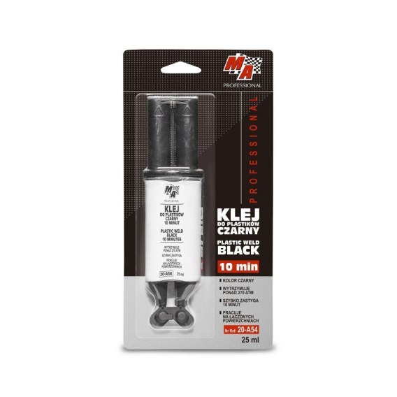 Klej do plastików MA Professional to szybko utwardzająca się masa przeznaczona do naprawy uszkodzonych / pękniętych przedmiotów wykonanych z różnych tworzyw sztucznych oraz innych materiałów. Skutecznie reperuje np. pęknięte zderzaki i lusterka samochodowe, plastikowe atrapy oraz inne elementy. Pracuje na łączonych powierzchniach. Produkt tworzy bardzo trwałe elastyczne spoiwo odporne na działanie temperatur do 120°C. Jest odporny na działanie olejów samochodowych, przekładniowych i hydraulicznych, benzyny, wody oraz wielu innych substancji. Wstępne utwardzenie następuje po upływie około 10 minut w zależności od temperatury otoczenia. Po dwóch godzinach produkt jest utwardzony w 80%. Pełne utwardzenie po 24 godzinach.