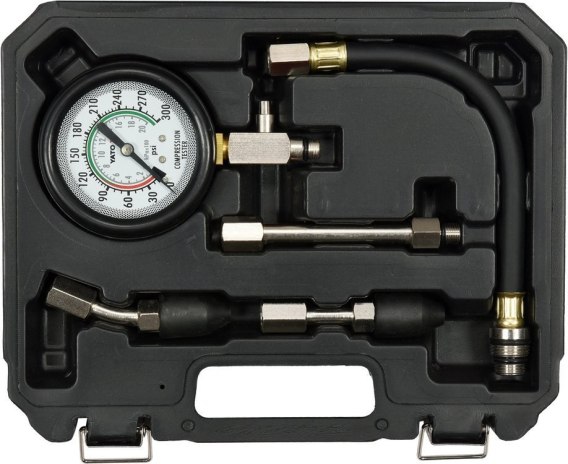 Pięcioczęściowy zestaw przeznaczony do pomiaru ciśnienia sprężania w silnikach z zapłonem iskrowym.