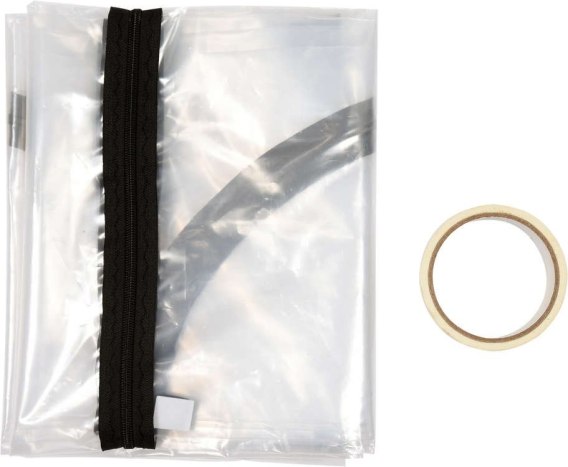 - Osłona przeciwpyłowa otworów drzwiowych wykonana z grubej, bezbarwnej, przezroczystej folii PE. Część otwierana ma kształt litery U i otwierana jest wszytym zamkiem błyskawicznym z pojedynczym suwakiem. Mocowanie folii odbywa się za pomocą taśmy klejącej.