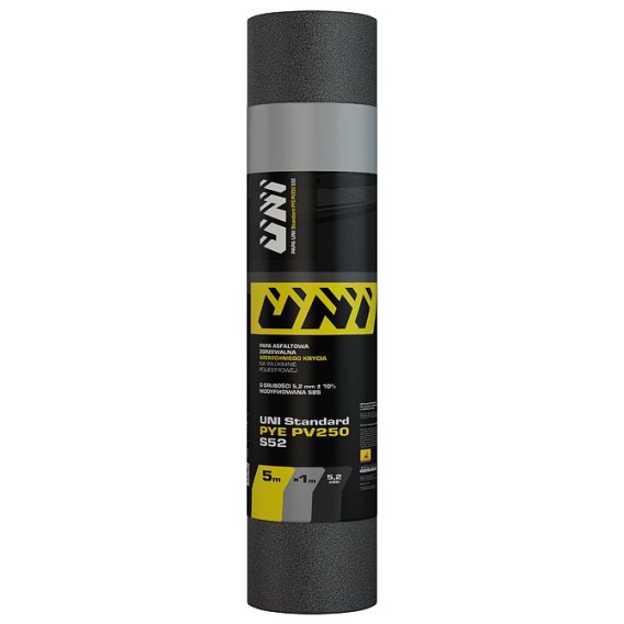 Papa asfaltowa zgrzewalna UNI STANDARD PYE PV250 S52 wykonana jest na osnowie włókniny poliestrowej.
