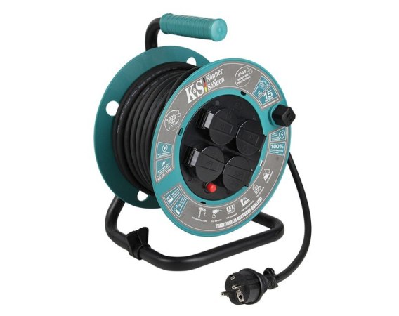 Przedłużacz na bębnie KS CR-15M o długości kabla 15m nadaje się do podłączenia do sieci 230V do 4 urządzeń jednocześnie w miejscach oddalonych od gniazdek prądu stałego. Posiada klasę ochrony IP44, co pozwala na stosowanie go na zewnątrz, a także przy wysokiej wilgotności, dzięki ochronie przed przypadkowym wnikaniem kropelek wody i cząstek stałych.