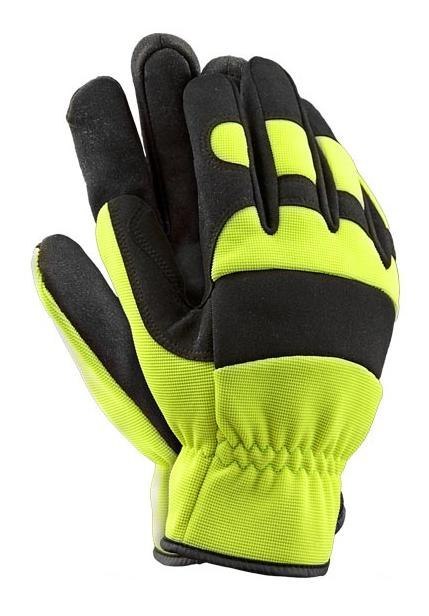 Rękawice ochronne wykonane z wysokiej jakości skóry syntetycznej połączonej z oddychającym materiałem spandex.część chwytna wykonana ze skóry syntetycznej.część wierzchnia wykonana ze spandexu we fluorescencyjnym kolorze żółtym, zwiększającym widoczność użytkownika z dodatkową wstawką z neoprenu na kostkach.na końcówkach i kostkach palców wzmocnienia ze skóry co zwiększa wytrzymałość rękawicy.małe dziurki na palcach po bokach, zapewniające lepszy przepływ powietrza.marszczenie w nadgarstku sprawia, iż rękawica przylega do dłoni i lepiej chroni przed dostaniem się do jej wnętrza wiatru czy piasku.popularnie stosowana do ogólnych prac mechanicznych
