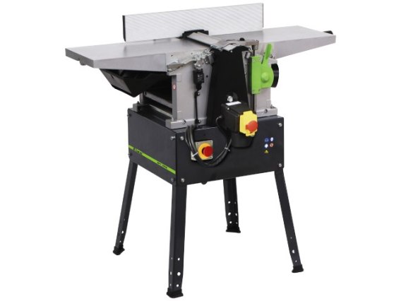 Strugarka uniwersalna wyrówniarko-grubościówka. Do ustawienia na podłodze. Korpus i stół wykonane z odlewu aluminiowego z rowkowanym stołem z żebrami (cichsza praca). Dobrze wyważony wał nożowy. Maszyna przystosowana jest do dołączenia odciągu wiórów (wyrówniarka i grubościówka) o średn. 100 mm. Wyrówniarka Przedni stół strugarski jest ustawiany indywidualnie na różną grubość wióra (poprzez śrubę pociągową). Przykładnia prowadząca wyrówniarki, wykonana z profilu aluminiowego - nastawiana w zakresie 90°-45°. Grubościówka Mocny stół z odlewu, przesuwany w górę i w dół za pomocą 4 śrub pociągowych. Zintegrowany kaptur odciągowy wiórów, z regulacją wysokości. Samoczynny posuw materiału, z zabezpieczeniem przeciwodbiciowym. Dostarczana w komplecie z silnikiem, wyłącznikiem wyzwalanym przy zaniku napięcia, 2 obracanymi nożami dwustronnymi, nastawnym ogranicznikiem wyrówniarki, kapturem do odciągu wiórów, stojakiem podłogowym i instrukcją obsługi. Klasa szczelności obudowy IP 54. Dla łatwiejszego przemieszczania mas