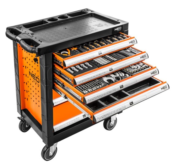Szafka narzędziowa NEO o wymiarach 770 x 460 x 870 mm. Szafka posiada 6 praktycznych szuflad na narzędzia, zamykanych za pomocą zamka centralnego. Wszystkie szuflady są w pełni otwierane, posiadają prowadnice kulkowe, zapewniające długoletnie, płynne i niezawodne działanie.
