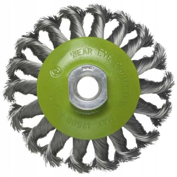 Kształt talerzowy. Ze skręconych drutów stalowych, do cięższych prac przy oczyszczaniu i obróbce powierzchni.