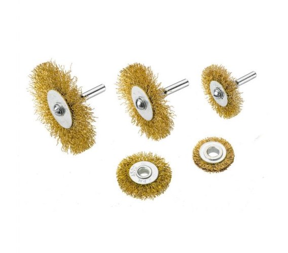 Szczotki druciane VERTO (nr ref. 62H614) zestaw 5 sztuk, z drutu stalowego, karbowanego, mosiądzowanego służą do oczyszczania powierzchni drewnianych i metalowych z brudu, rdzy, powłok lakierniczych. Trzpień o średnicy 6 mm pozwala mocować szczotki we wrzecionach wiertarek i wkrętarek. Marka VERTO oferuje asortyment elektronarzędzi i akcesoriów dla każdego majsterkowicza.