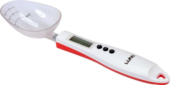 Waga kuchenna LUND z łyżką o całkowitej pojemności 75ml i maksymalnym obciążeniu 300g. Wyposażona w czytelny wyświetlacz LCD pokazujący 2 jednostki wagi do wyboru oraz wskaźniki przeciążenia i niskiego poziomu baterii. Urządzenie posiada aż 4 przydatne funkcje - pomiaru, utrzymywaniu cyfry na wyświetlaczu, sumowania i tary.
