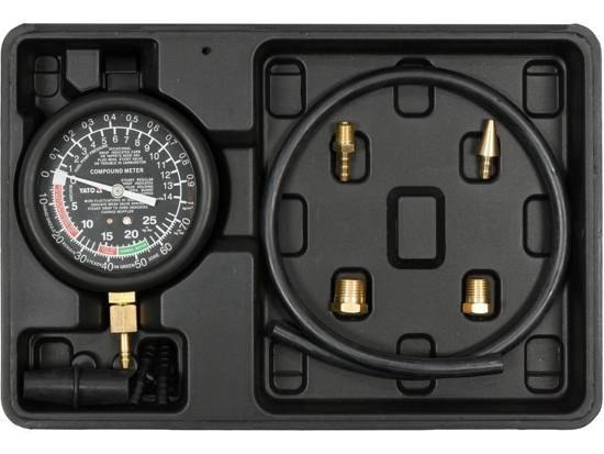 9-częściowy zestaw przeznaczony do pomiaru ciśnienia w układach podciśnieniowych, gaźnikowych, kolektorach ssących, Servo. Wykorzystywany także do badania układów hamulcowych, zaworów selenoidowych, elektryczno-podciśnieniowych, wtryskiwaczy, elektrycznych i mechanicznych pomp paliwowych oraz diagnostyki zaworów.