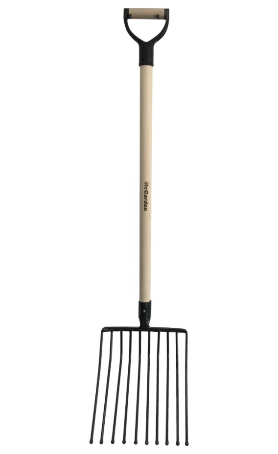 Widły (gable) przerzucania ziemniaków 10- zębowe, zakończone kulkami nie kaleczą, stal węglowa hartowana do 46 HRC, trzon drewniany buk typ T - 100