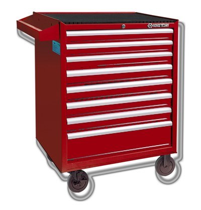 Wózek warsztatowy King Tony z 8 szufladami. Szuflady łożyskowane z wygodnym uchwytem, ładowność wózka 360kg, malowany proszkowo, centralny zamek, jednoczęściowy stalowy korpus, góra zabezpieczona 10 mm matą gumową, przemysłowe kółka z hamulcem do podłogi TPR