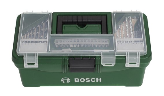Zestaw wierteł, bitów i kołków oraz narzędzi ręcznych w skrzynce narzędziowej.