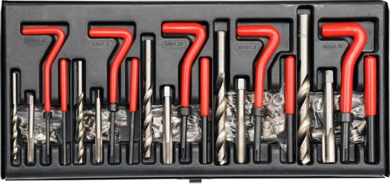 Profesjonalny zestaw do naprawy gwintów M5-M12. Wiertła i gwintowniki wykonane zostały ze stali szybkotnącej HSS 4341. Gwintowniki jednostopniowe nacinają gwint, w który wprowadza się wkładkę spiralną z twardej stali nierdzewnej. Do wprowadzenia wkładki służy pokrętło prowadzące oraz wybijak, który obłamuje wystającą końcówkę wkładki. Zestaw przeznaczony do 5 rodzajów gwintów: M5 x 0.8 x 6.7 mm, M6 x 1.0 x 10.8 mm, M8 x 1.25 x 10.8 mm, M10 x 1.5 x 13.5 mm, M12 x 1.75 x 16.3 mm.