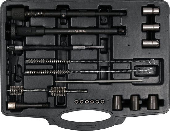 Zawartość zestawu: frez x3 | tuleja centrująca x3 | przyrząd do demontażu podkładek wtryskiwaczy | pokrętło do frezów | szczotka do czyszczenia ręcznego x2 | szczotka do czyszczenia mechanicznego x2