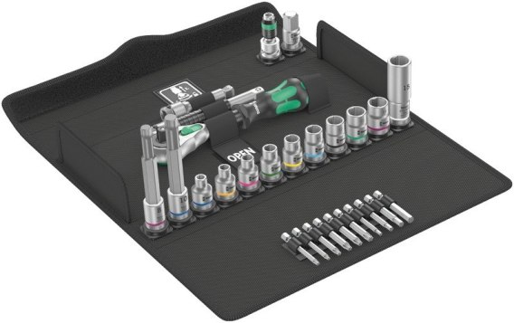 27-częściowy zestaw z grzechotką 3/8", w tym grzechotka Zyklop Speed drobnozębna, swobodnie obracająca się główką grzechotki, przycisk zwalniający przełącznik kierunku pracy prawo/lewo