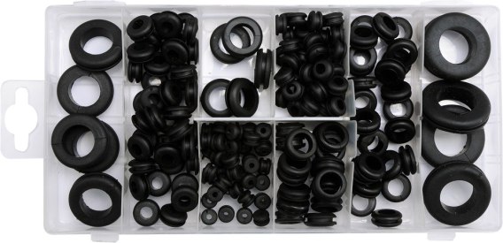 Zestaw przelotek gumowych zawiera 180 sztuk w rożnym rozmiarze.