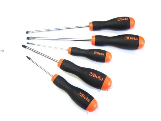 Komplet pięciu wysokiej klasy wkrętaków BETA EASY 1201 i 1202. Składa się z trzech wkrętaków płaskich i dwóch krzyżakowych. Rękojeść pokryta gumą antypoślizgową. Całość zapakowana w firmowe pudełko BETA.