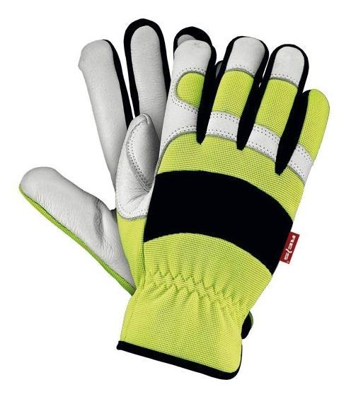 Rękawice ochronne wykonane z wysokiej jakości skóry bydlęcej połączonej z materiałem.