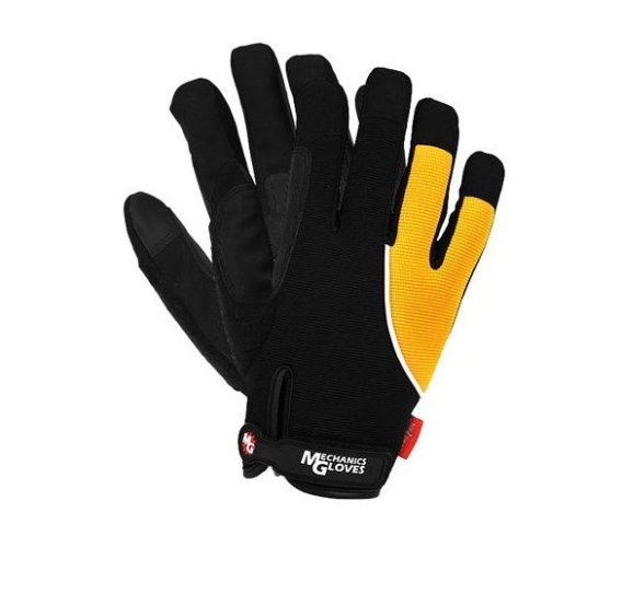 Rękawice ochronne wykonane z wysokiej jakości miękkiej skóry syntetycznej połączonej z tkaniną.