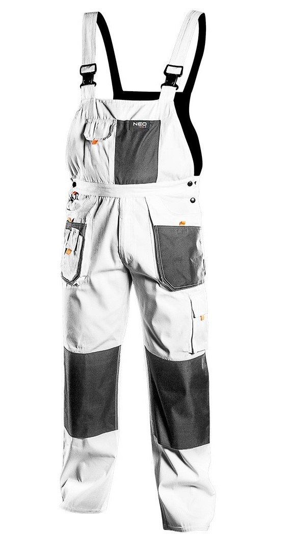 Białe spodnie robocze na szelkach NEO wykonane są z wysokiej jakości materiału, wzmocnionego w miejscach narażonych na przetarcie. Potrójnie przeszyte szwy, zwiększające trwałość łączenia oraz opcję włożenia nakolanników. Solidne kieszenie przechowają niezbędne narzędzia, a dzięki szelkom nawet duże obciążenie nie spowoduje dyskomfortu podczas pracy. Spodnie wyróżnia kieszeń na smartfona - powiększona względem dotychczasowych projektów, by zmieściła modele o większej przekątnej ekranu. Gwarantem jakości jest certyfikat europejski oraz wykonanie zgodne z normą EN ISO 13688:2013. Marka NEO spełnia oczekiwania profesjonalistów.