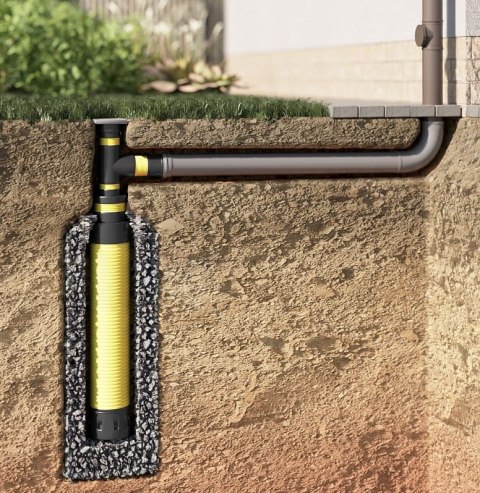 Przy braku możliwości odprowadzenia wody do kanalizacji deszczowej (Rynny), prostym i tanim rozwiązaniem jest zastosowanie studzienki drenarskiej rozsączającej .