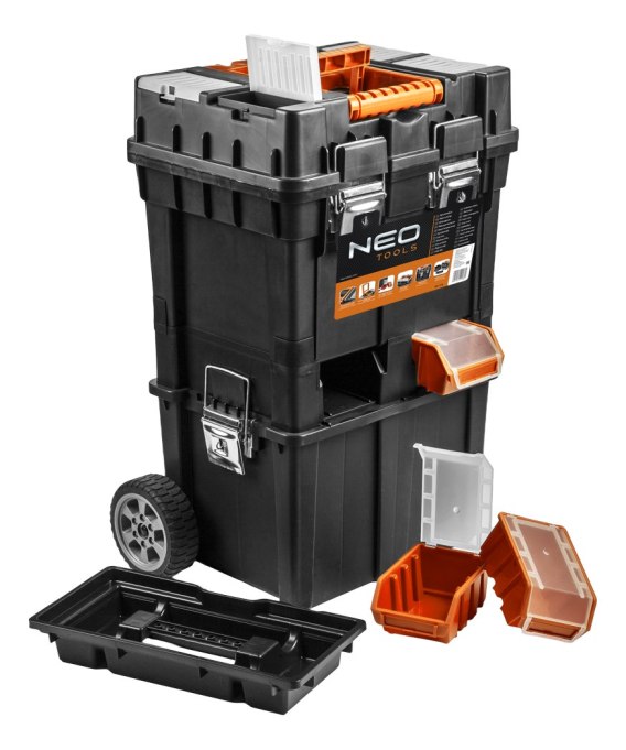 Wyposażony został w koła do łatwiejszego przemieszczania się. Warsztat składa się z 3 funkcjonalnych elementów. Jest kompletnie rozbieralny. Górna część składa się ze skrzynki narzędziowej, środkowy moduł składa się z czterech ergoboxów a dolny z pojemnej skrzyni na większe narzędzia. Warsztat posiada także 4 organizery do przechowywania drobnych elementów, tackę wewnątrz i wygodne dwa uchwyty do przenoszenia lub ciągnięcia. Marka NEO spełnia oczekiwania profesjonalistów.