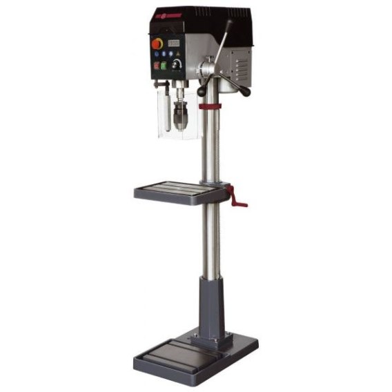 Wiertarka z płynną regulacją prędkości obrotowej i wyświetlaczem pokazującym aktualne obroty. Stół przechylany w zakresie 45°. Przeznaczona dla rzemieślników i do mniejszych warsztatów przemysłowych. Dostarczana z uchwytem szybkomocującym, osłoną uchwytu i wyłącznikiem bezpieczeństwa zwalniającym przy zaniku zasilania.