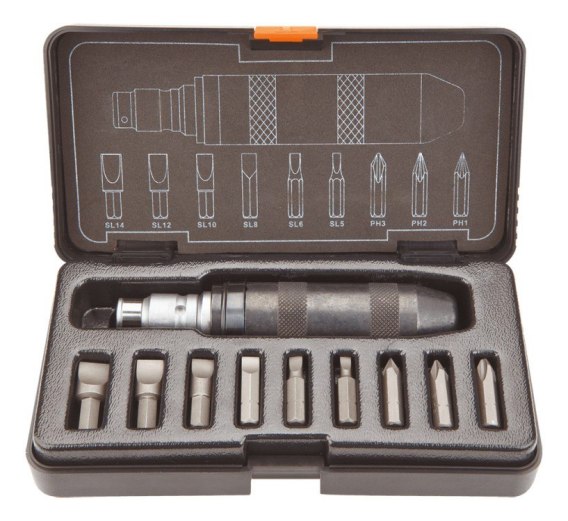 Wkrętak udarowy 1/2" NEO zawiera 10 elementów, w tym 9 końcówek wkrętakowych w popularnych rozmiarach (płaskie, krzyżowe) oraz uchwyt udarowy. Zastosowanie stali stopowej S2 w końcówkach wydatnie wydłuża ich trwałość.
