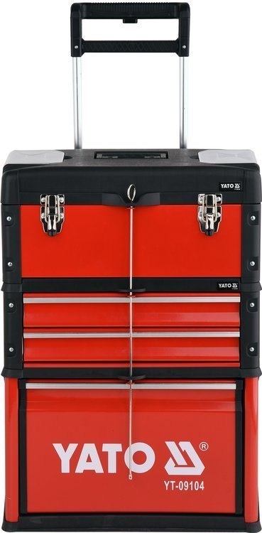 Wózek narzędziony 3-częściowy marki YATO z wyposażeniem 78 elementów.W skład zestawu wchodzi skrzynka dolna wyposażona we wbudowane kółka, teleskopową rączkę aluminiową oraz dużą szufladę uchylną.