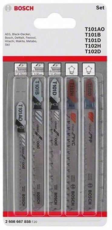 W skład zestawu wchodzą brzeszczoty nadające się do czystych cięć prostych i krzywoliniowych w drewnie.