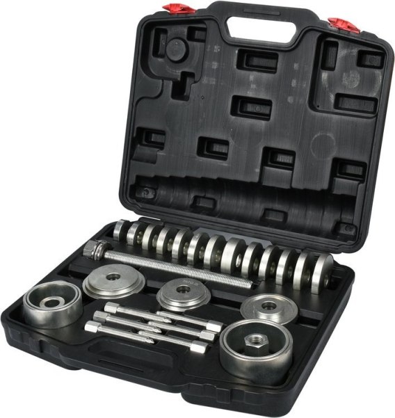 Zawartość zestawu: pierścienie x14|tuleja wyciskowa x4 (O76 mm, O83 mm, O91 mm, O102 mm)|śruba do demontau piast x6 (M12x1.5 mm x3, M14x1.5 mm x3)|tulejka redukcyjna|wrzeciono (38 mm, L=300 mm)|nakrętka wrzeci
